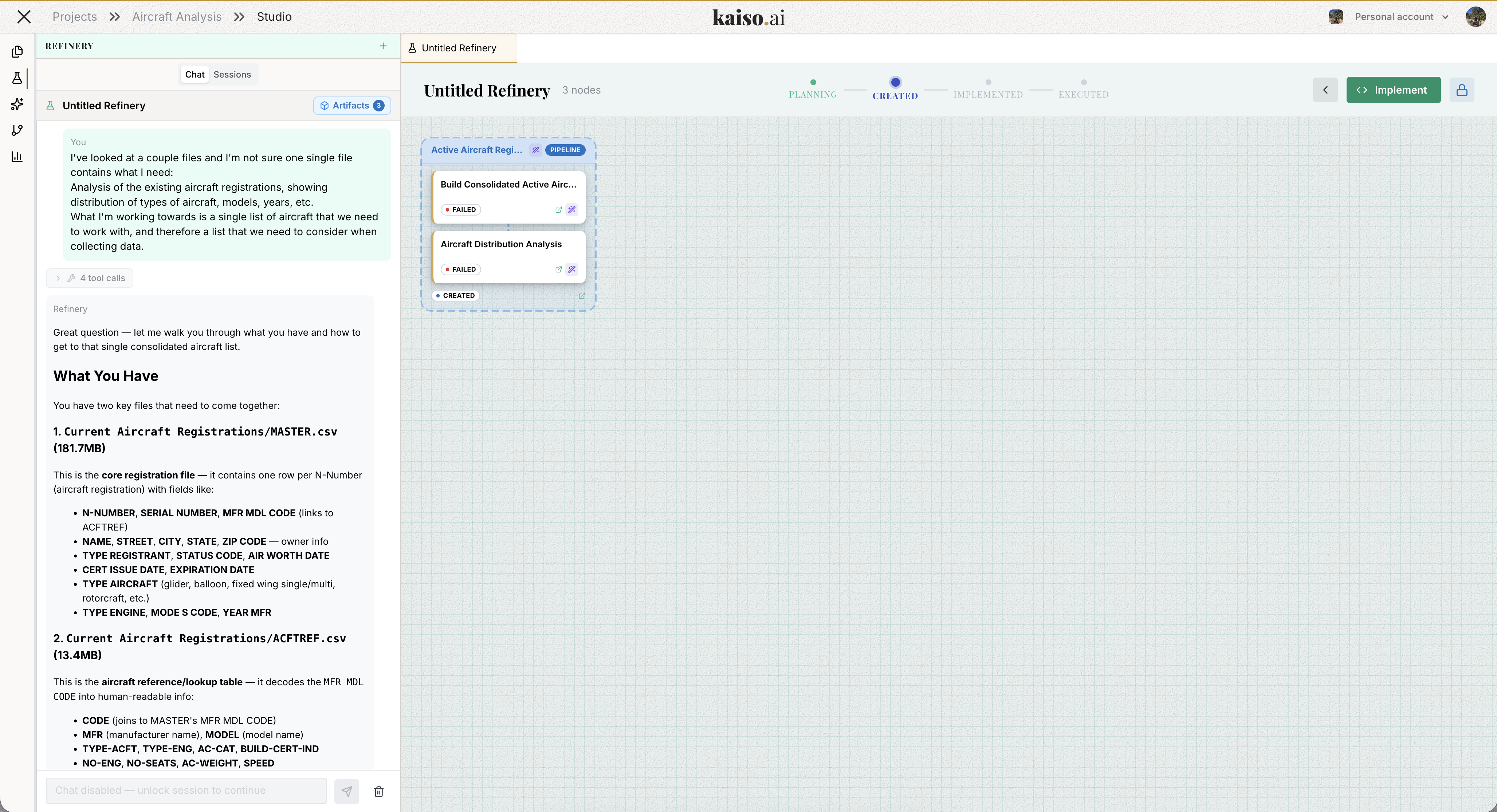 Kaiso turns ad-hoc data work into auditable, composable, reproducible artifacts — without requiring users to know Python or have a local dev environment.